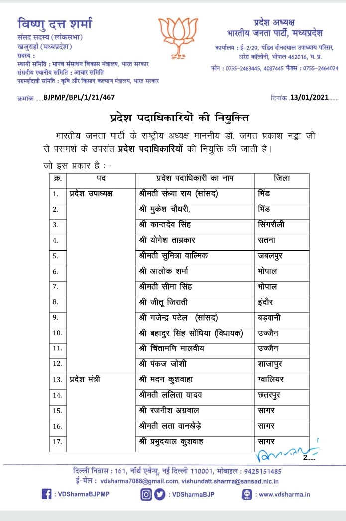 मध्यप्रदेश भारतीय जनता पार्टी के नवनियुक्त पदाधिकारी गण