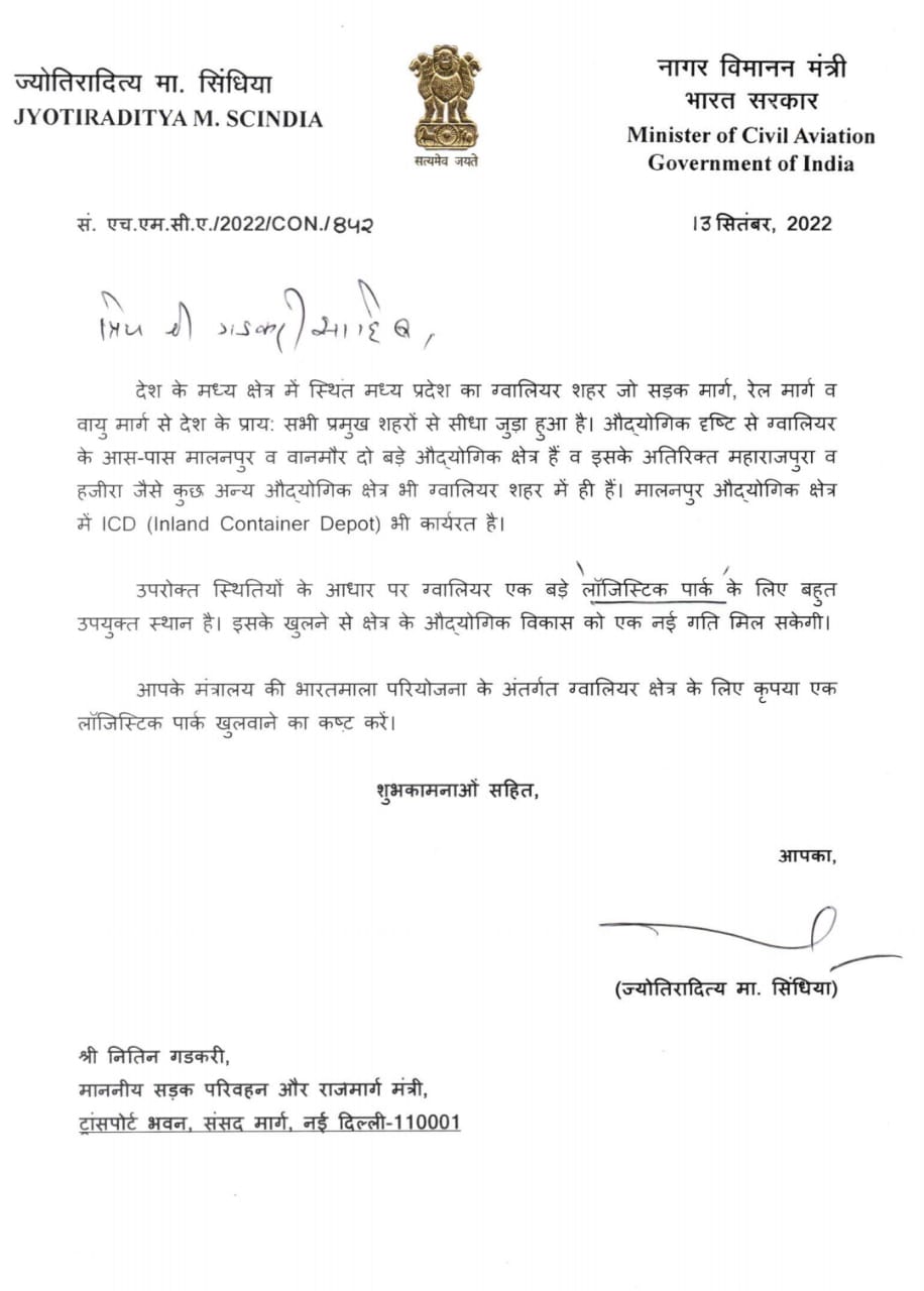 ग्वालियर में लॉजिस्टिक पार्क के लिए केंद्रीय मंत्री सिंधिया ने लिखा गडकरी को पत्र।